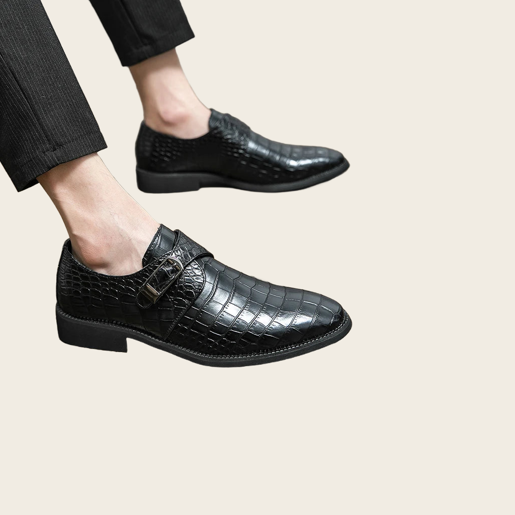 Step into refined sophistication with these casual business shoes, crafted from premium microfiber with a rich croc-textured finish. Designed with a sleek buckle strap closure, they offer a secure fit and polished appeal. The durable rubber outsole ensures comfort and stability throughout the day, making them ideal for office wear, formal events, or smart casual styling.